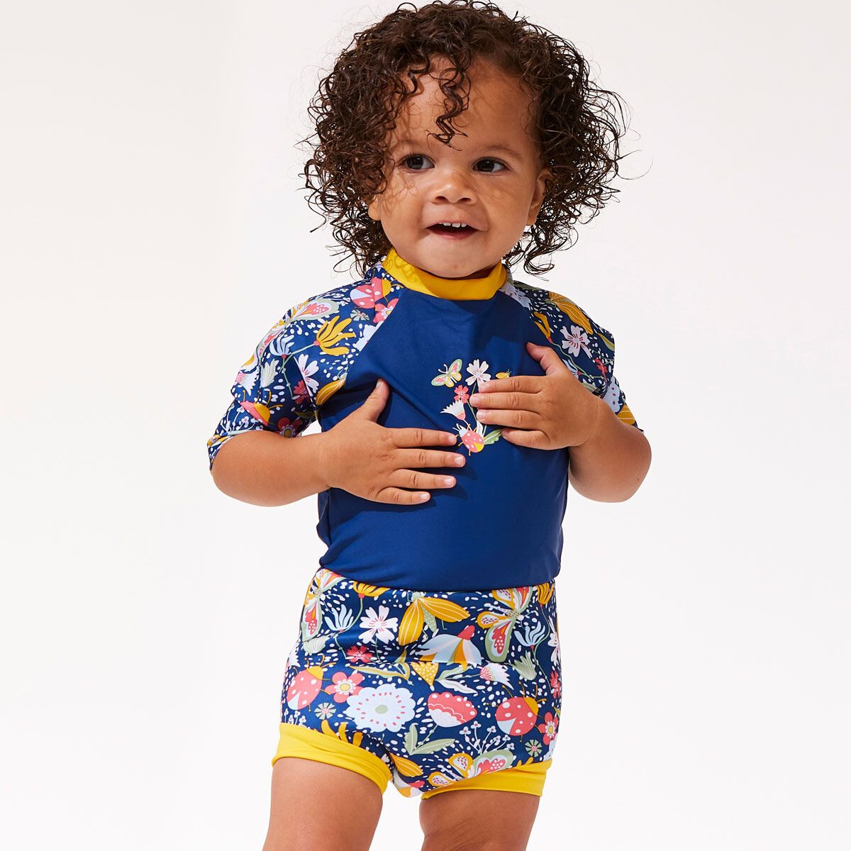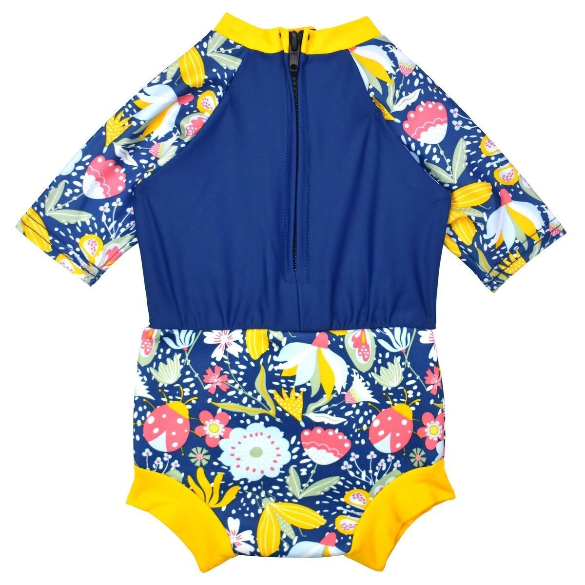 Kombinuje celoneoprénové plienky Happy Nappy s topom s dlhým rukávom UPF50+ pre spoľahlivú ochranu proti pretečeniu a slnku. Nylon-Lycra top je ľahký a chladivý a pokrýva oblasti, ktoré sú najviac citlivé na slnko, takže vaše dieťa je chránené, aj keď je vo vode. Ako pri všetkých našich produktoch Happy Nappy, spodná polovica ponúka úplnú ochranu pred únikom fekálií, pričom je pohodlná a roztomilá.